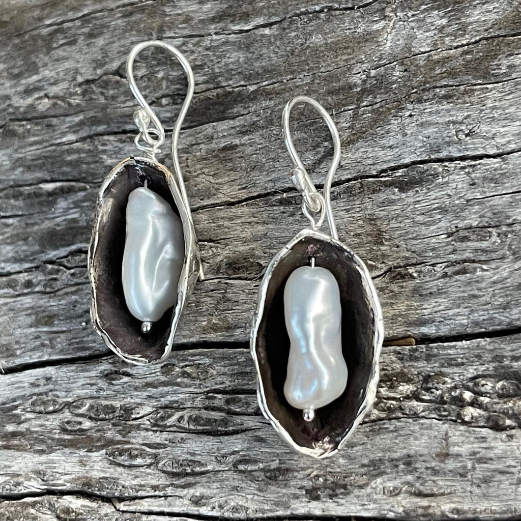 The pod earrings are cast in sterling silver with a baroque pearl in each pod.